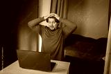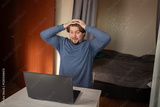 A man at a laptop rejoices at his victory, typing on a computer at a table, balancing freelance work and study in a cozy home.