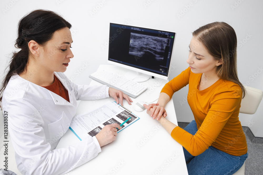 Gynecology, consultation of gynecologist. Gynecologist consulting a woman patient, talking about women's health and diseases of uterus and ovaries