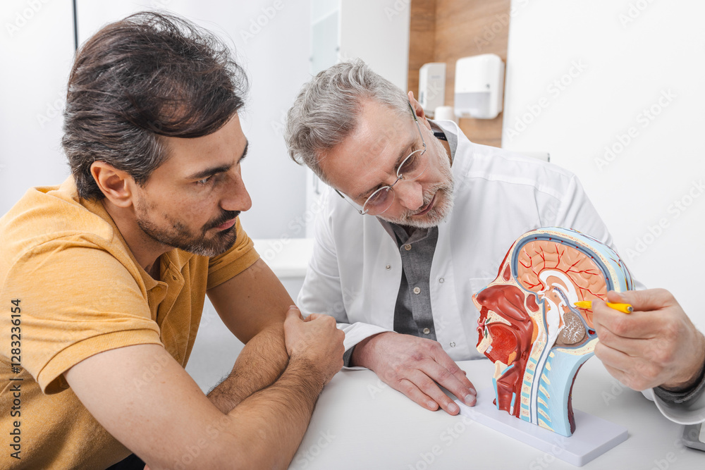 Doctor showing head structures on anatomical model to patient with headaches during consultation in neurology. Treatment of migraines and headaches
