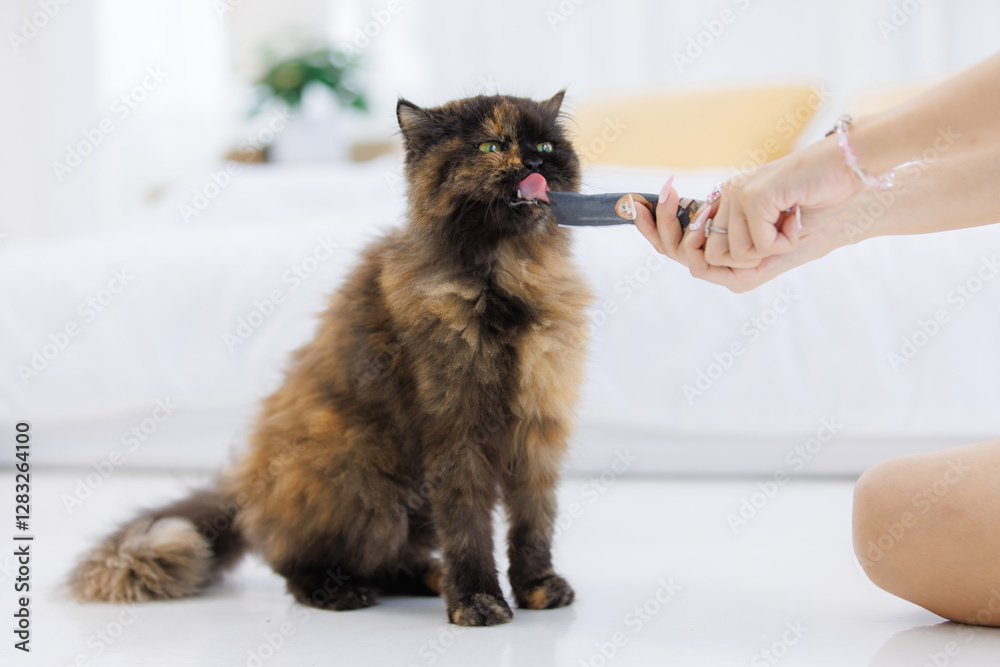 Closeup studio shot of tortoiseshell cute little fluffy hair breeds green eyes kitten pussycat companion sitting down relaxing eating cat jelly treat while human owner feeding on floor in living room