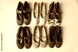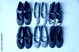 Flat lay of stylish ballet flats in various colors and patterns on pastel background