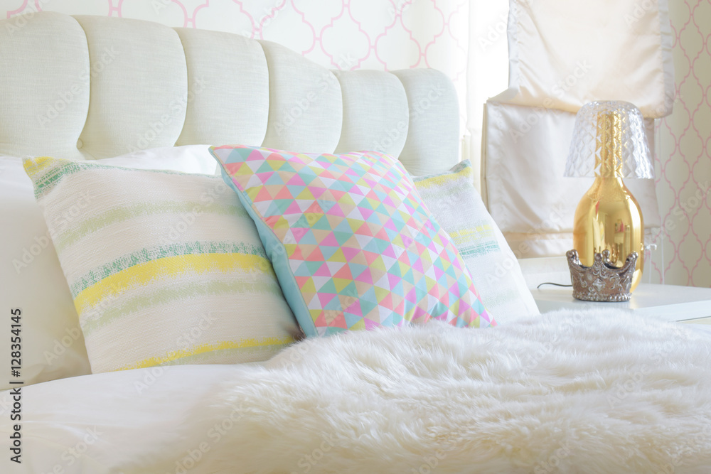 Fur on bed with sweet color pillows in background