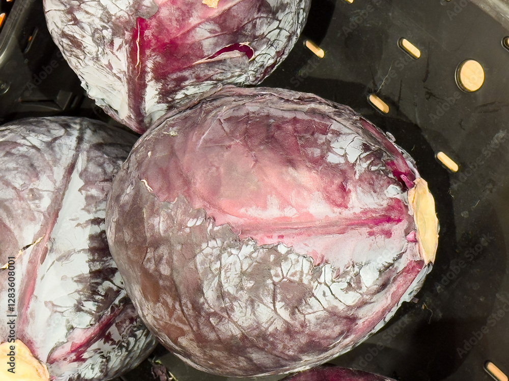 Fresh purple cabbage display in market basket