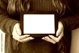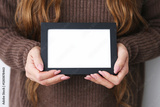 Woman holding an empty photo frame with blank copy space. Hands of a girl in a cozy sweater presenting a picture frame. Mockup for artwork, photography, or message display.