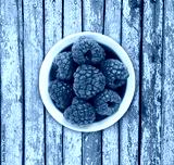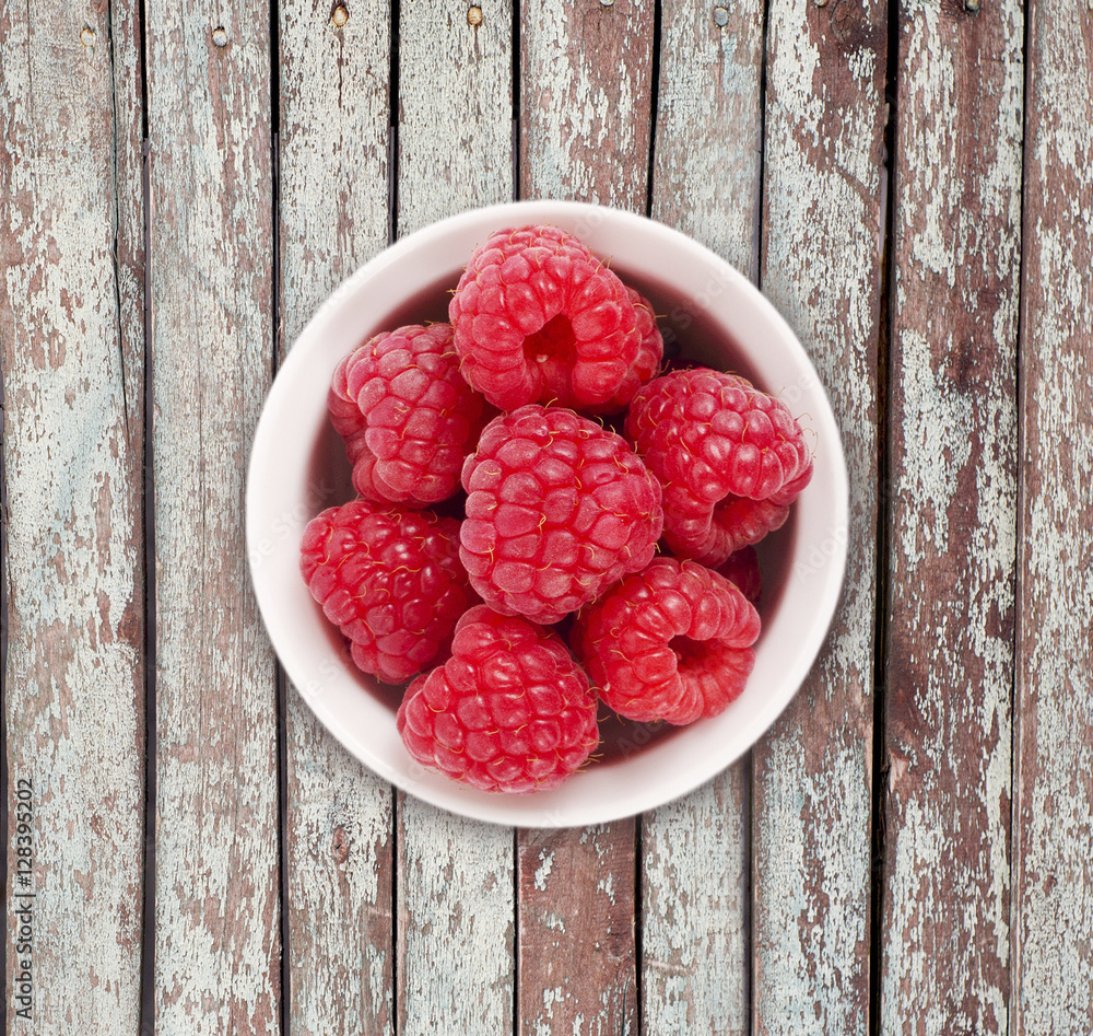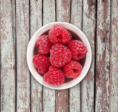 Raspberries in a white ceramic bowl. Ripe and tasty raspberries isolated on a wooden background. Top view.
