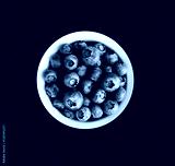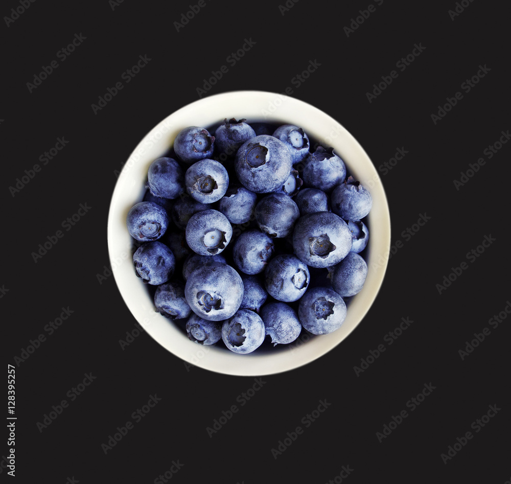 Blueberries in a white ceramic bowl. Top view. Ripe and tasty blueberries on black background.