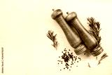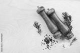 Culinary background with salt and pepper wooden mills or grinders with rosemary on the kitchen table top view.