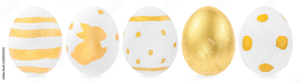 Set of white easter eggs with golden patterns isolated on white background. Easter decoration.