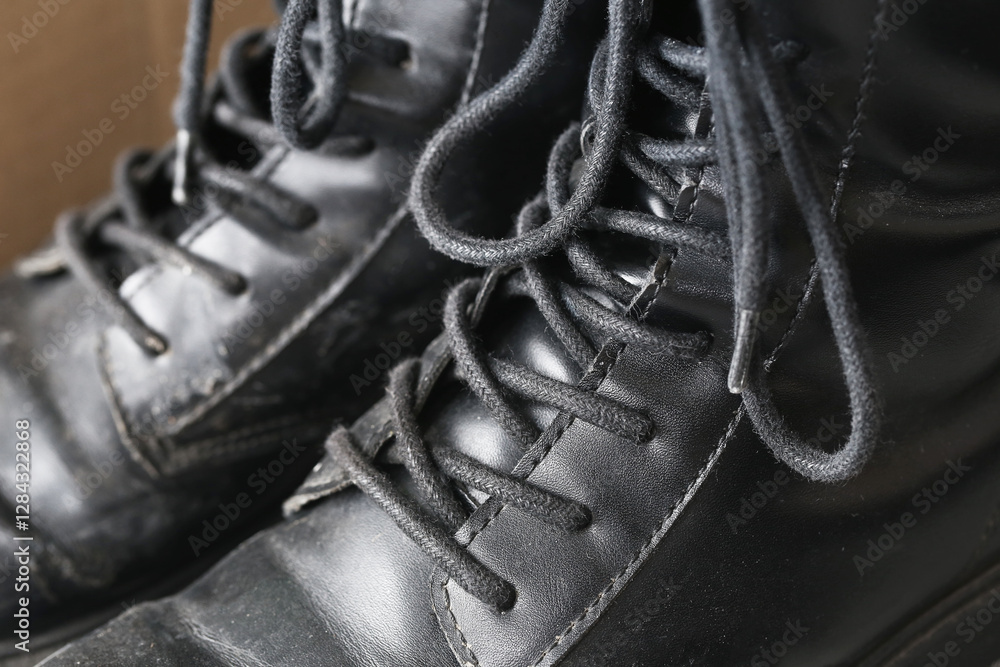 Black leather shoes. Closeup of shoelace. Used dirty grunge footwear. Shiny leather material Winter boots background.