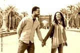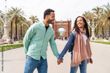 Beautiful hispanic young couple dating outdoors and visiting European city's landmarks - Tourists having fun on travel vacation