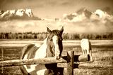 Vintage toned photo of a chestnut horse with Grand Teton mountains in background, Wyoming, USA.