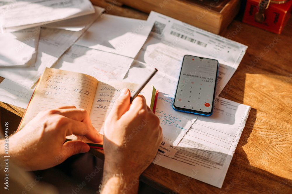 Close-up of men's hands with a calculator and utility bills. The concept of rising prices for heating, gas, and electricity.