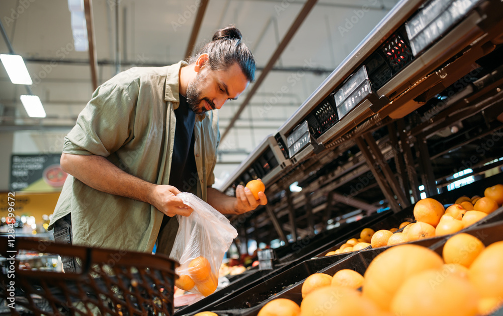 A young man is shopping at the supermarket. The guy picks vegetables and fruits from the counter in the store