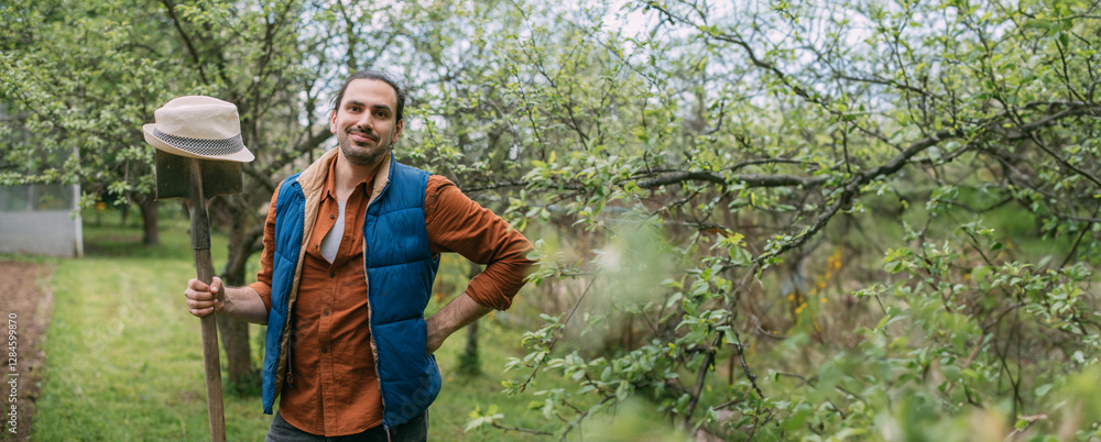 Portrait of a weary farmer, gardener shoveled in his hands on his plot of land in spring.