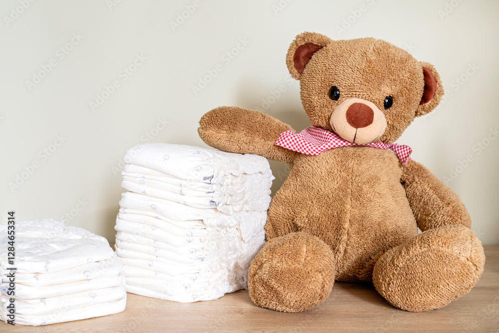Stack of diapers with toy teddy bear on table.Newborn nappies concept