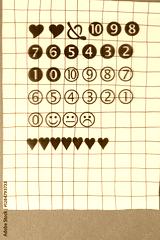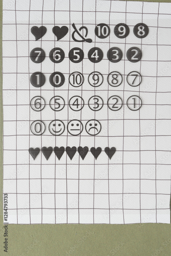 transparency sheet with random set of numbers and emojis on paper with grid