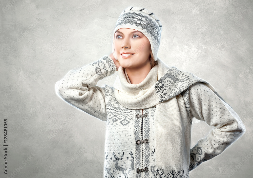 Close-up portrait of beautiful young woman in stylish woollen kn