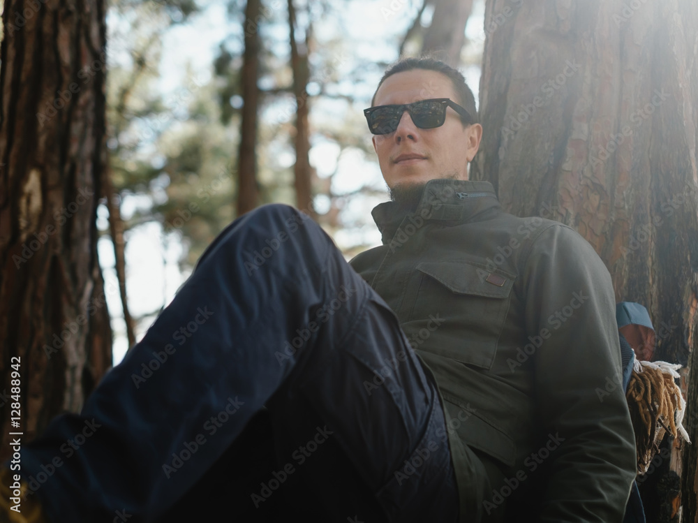 Traveler resting in autumn forest