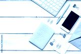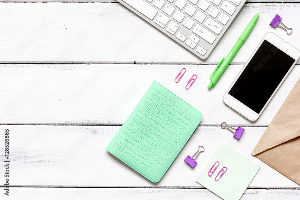 female wooden desktop with smartphone, paper envelopes top view