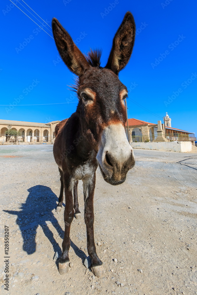 Donkey in front of st. Andrews monastery (Apostolos Andreas Manastiri) on Karpas peninsula, Cyprus