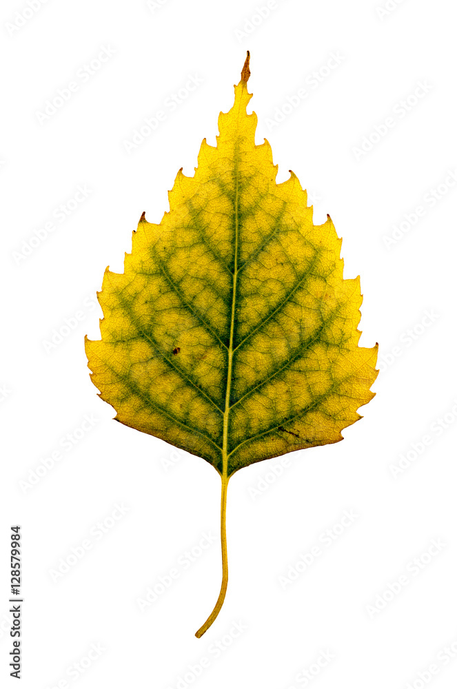 Close-up Photograph of a withering autumnal birch tree leaf isol