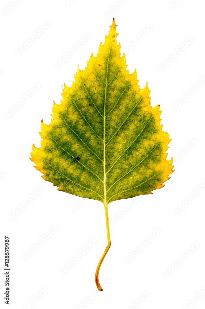 Close-up Photograph of a withering autumnal birch tree leaf isol