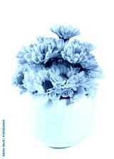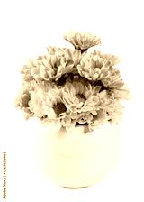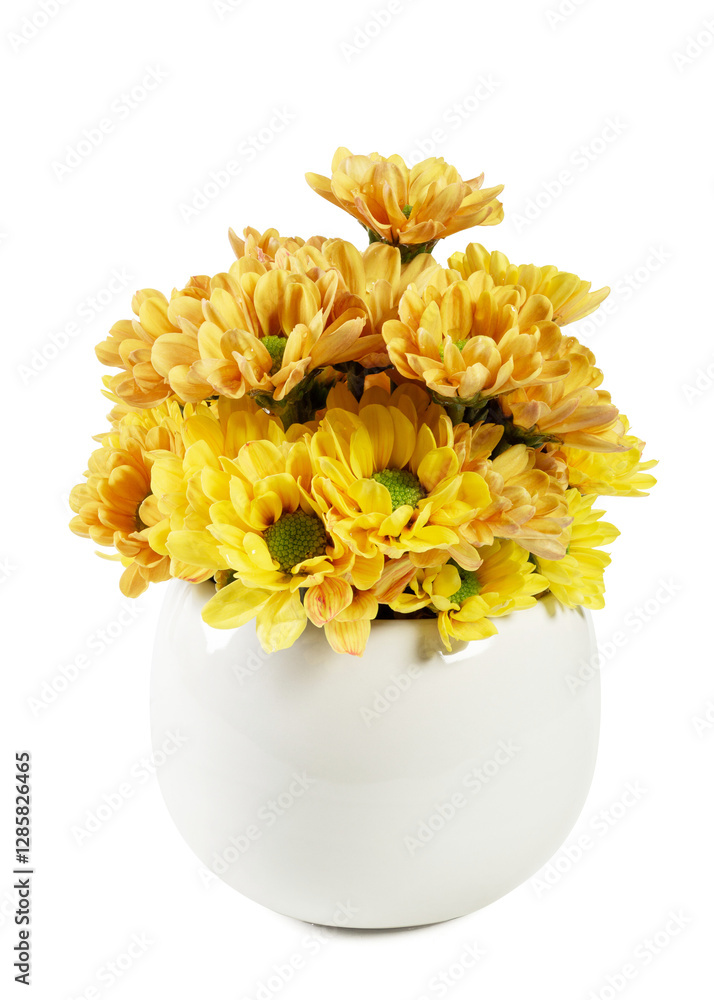 A centered, close-up shot capturing a bouquet of vibrant yellow chrysanthemums arranged in a white, rounded vase against a plain white backdrop.