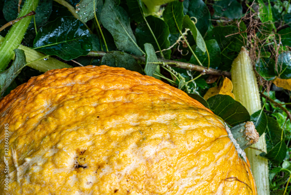 pumpkin in the garden, autumn harvest time, gardener's concept, autumn harvest, macro