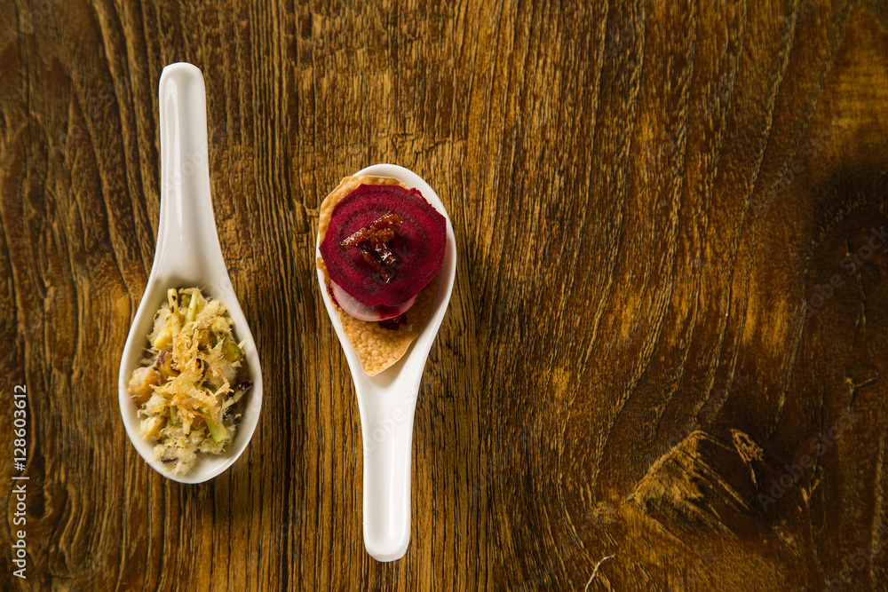 Shredded cod with scrambled eggs, banana puree and crispy potato in a spoon. Taste gastronomy finger food