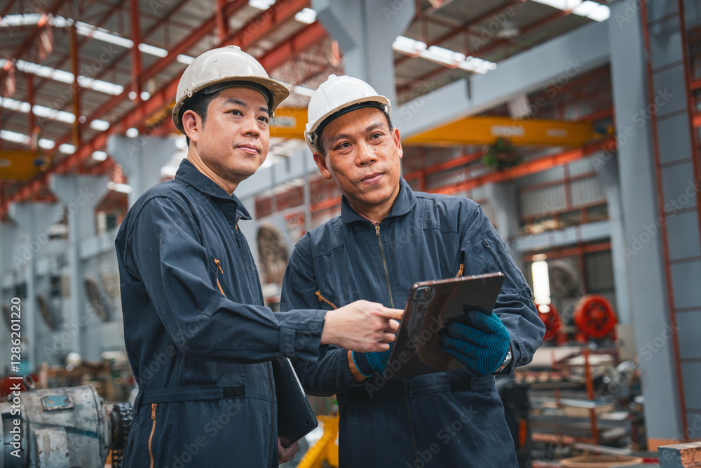 Two Professional engineering worker are discussing, planning, checking or examining the quality of Plate rolling, metal sheet with the order of factory with laptop or tablet. Teamwork and successful.