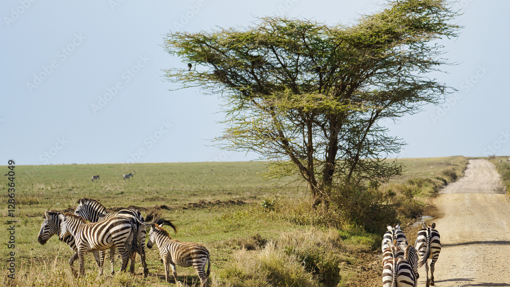 Zebras gracefully graze beneath a large tree in a beautifully serene landscape setting Serengeti Tanzania Africa