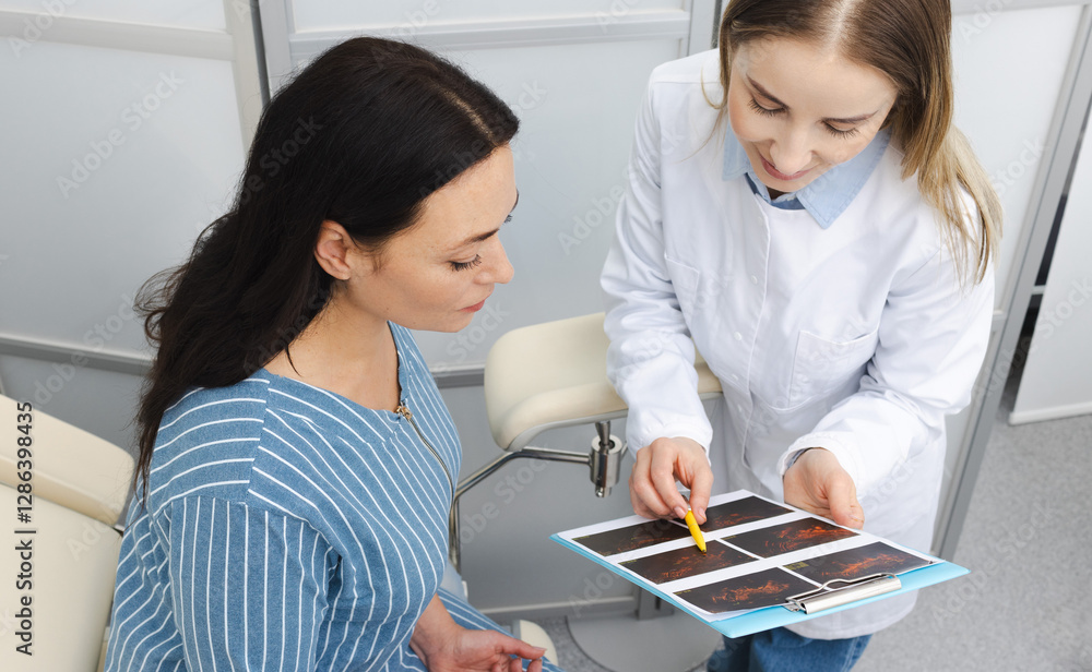 Woman patient and gynecologist analyzing folliculometry results, growth follicle, ovulation in gynecology clinic. Pregnancy planning under the supervision of a gynecologist