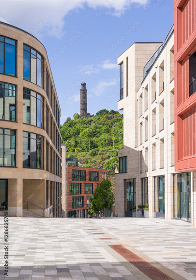 Modern architecture with Nelson Monument in Edinburgh, UK