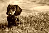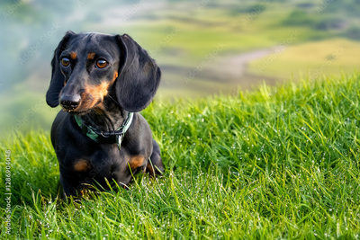 Jamnik siedzący na trawie, odpoczywający na zielonej murawie. Spokojna poza, urokliwy wygląd i charakterystyczna sylwetka tej rasy.