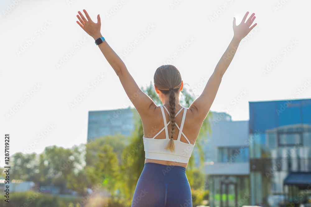 Rear view of excited Caucasian athletic woman runner raising arms celebrating success after jogging in urban city park on sunny day. Jogger champion winning marathon. Active sportswoman motivation.