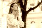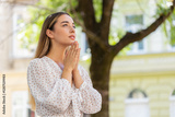 Portrait of young woman praying with closed eyes to god asking for blessing, help, forgiveness outdoors. Pretty girl clasping hands wishing luck in sunny urban city street. Town religion lifestyles.