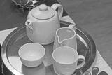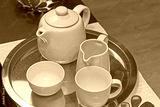 White porcelain ceramic tea set at gold tray table top