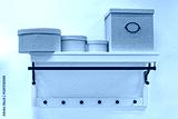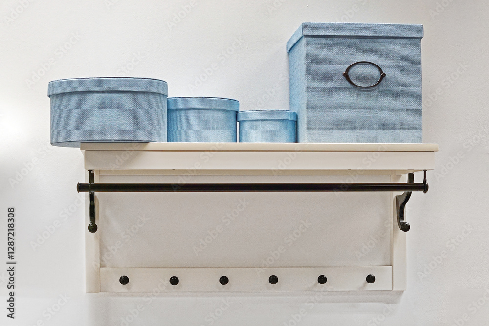 Decorative storage boxes at rack shelf in home