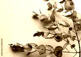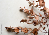 Nature background - top down view of dried brown eucalyptus leaves on natural limestone with copy space to left (selective focus)
