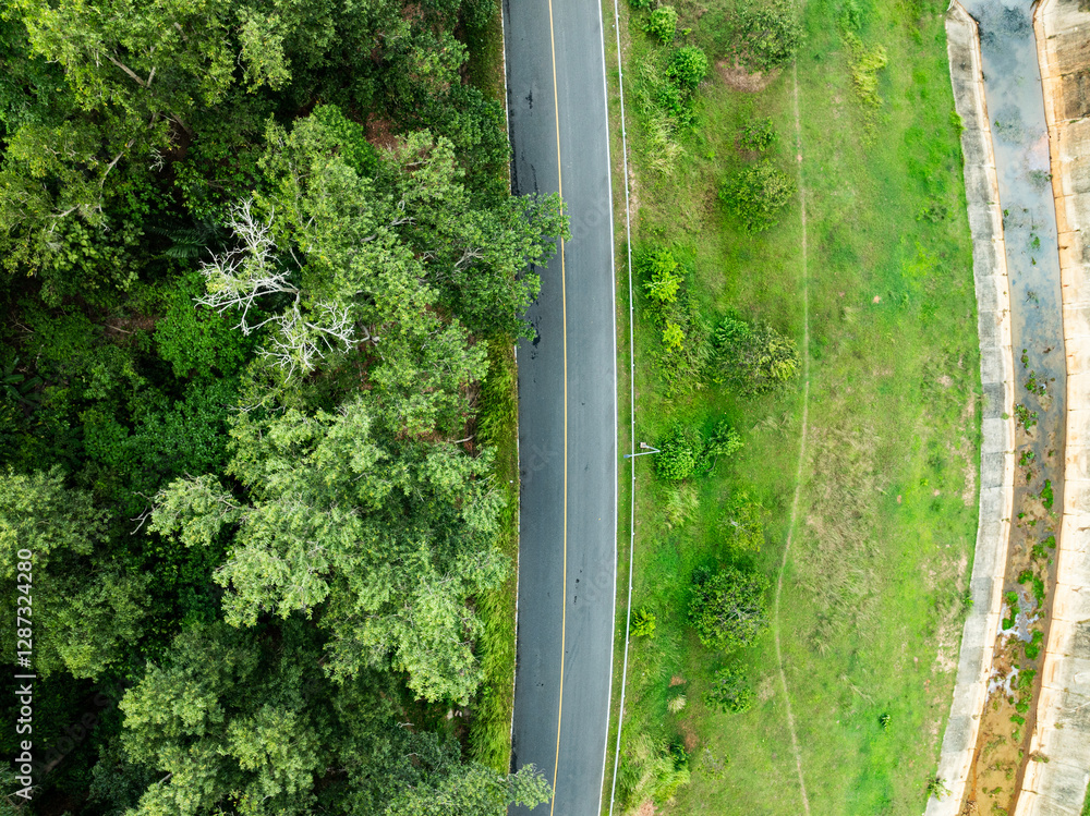Aerial Drone shot bird eye view rainforest and road around the dam lake,Landscape nature view