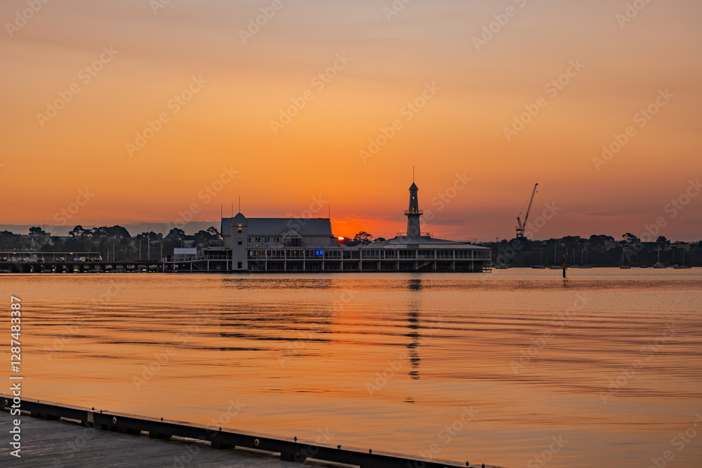 Sunset over Geelong with Cunningham Piern over the calm waters of Corio Bay. Victoria, Australia.