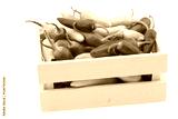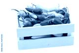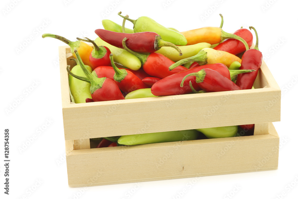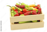red and green rawit peppers (Capsicum annuum 'Bird's Eye') in a wooden box on a white background