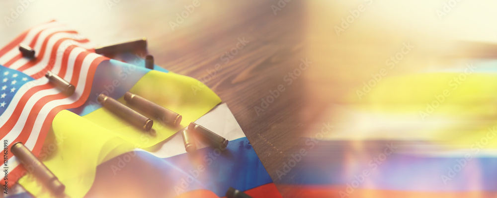 Solidarity war. Politics. The flags are on the table. The concept of support in a military conflict.