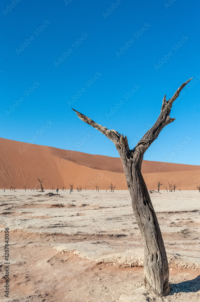 Landscape shot of the iconic dead trees of the Namibian deadvlei area.