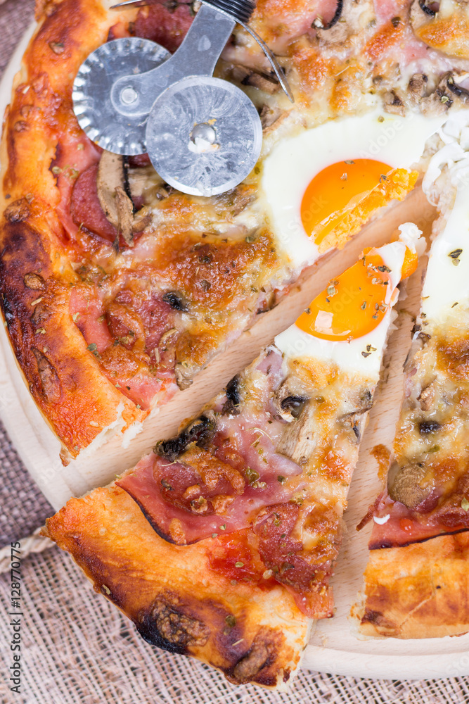 Flat lay of pizza slice with egg ham mushrooms