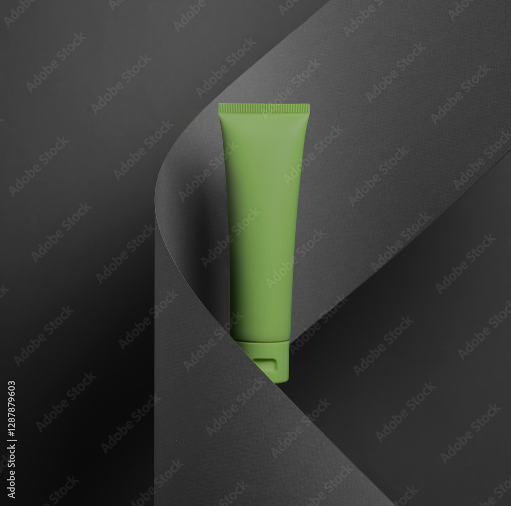Green Tube on a Black Curved paper Background - Skincare or Cosmetic Product Mockup