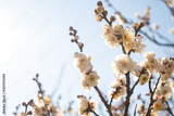 Plum Blossom, branches with white blossoms of a blooming fruit tree during spring at daytime in Tokyo city in Japan.