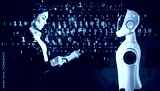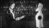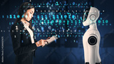 Businesswoman interacting with humanoid robot using tablet in digital environment.