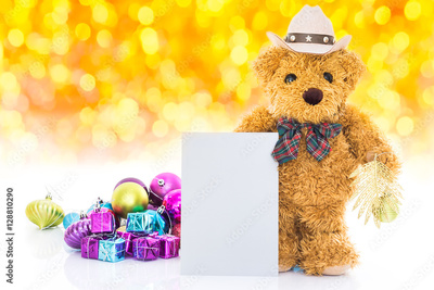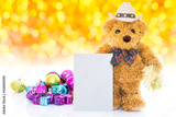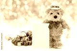 Teddy bear with gifts and greeting card