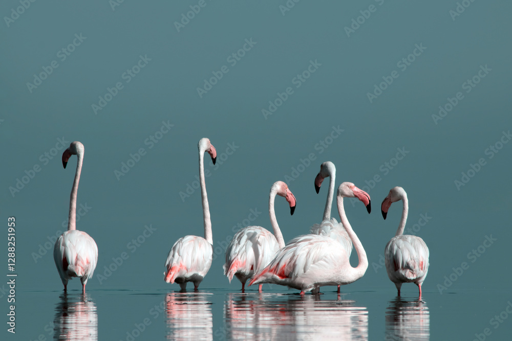 African wild birds. A flock of great flamingos on the blue lagoon against the bright sky